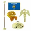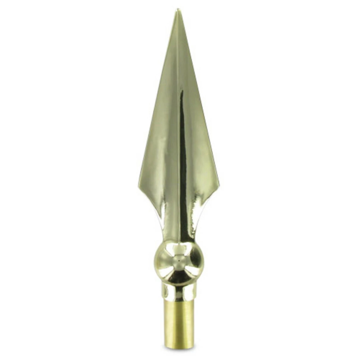 This flat spear is made of metal and measures 10 inches x 2.75 inches. It is coated in a shiny gold and comes with a ferrule. It is to be used with indoor wooden poles.