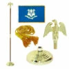 The perfect display kit for the flag enthusiast or the classroom. This 7-foot Oak Finish Indoor Flagpole Set by Valley Forge comes with everything you need to showcase your American flag with pride, whether in your home, office or the classroom. This set comes with a 3ft x 5ft gold fringed US made nylon flag with sewn stripes and embroidered stars that looks beautiful anywhere you put it. This set also includes a weighted floor stand and a 7-inch plastic bald eagle topper to add that extra bit of class and flare. The flagpole comes in two pieces, includes a brass screw joint and is topped off with a lovely oak finish. Gold rope tassels add to the visual appeal of this display kit making it a welcomed addition to any indoor presentation set.