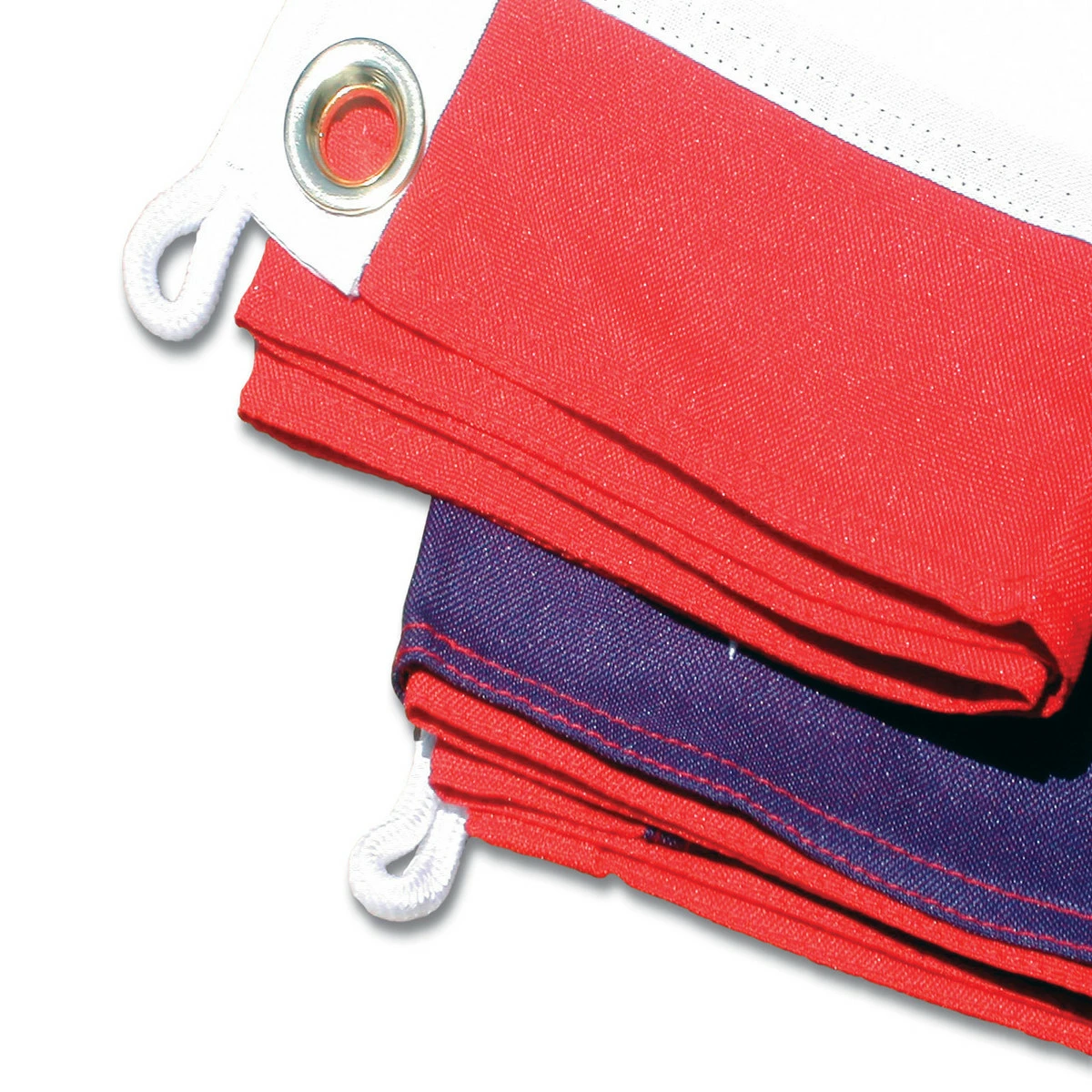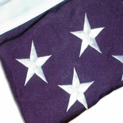 This flag is made from one of the most durable flag materials on the market: spun polyester. The open weave reduces fabric stress and resists high winds. These flags are the best choice if you fly the flag 24/7 and if the flag is flown in an area with high wind speeds. As these flags are made from heavier fabric, they require a higher wind speed to “fly” than nylon flags and they require more effort to put up and take down. The polyester fabric looks like a coarse cotton, resists fraying and is designed for outdoor use. This flag is very attractive: it has sewn stripes, embroidered stars, a sturdy canvas heading, and brass grommets. These flags do not work with our EZ clips. You will need to order our Rotating flag rings to hang from a wall mount pole.