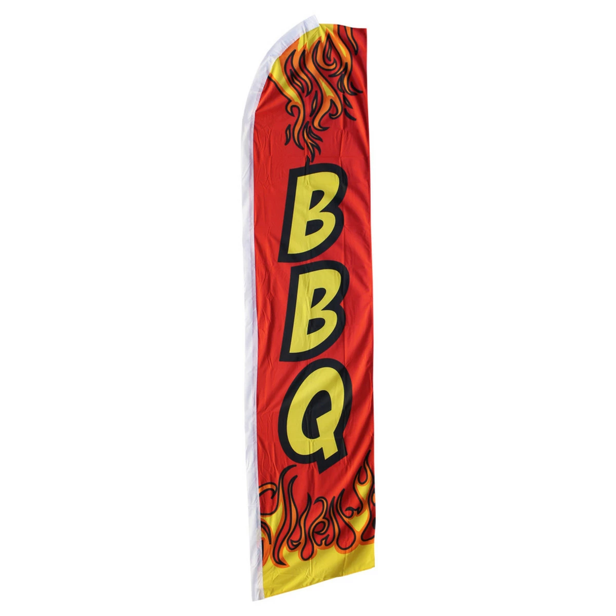 This red BBQ Swooper Flag is made from a knitted polyester that is built to withstand winds over time. The design of the flag easily catches peoples attention and it doesn’t wrap around the pole. Flag measures 11.5ft x 2.5ft.
