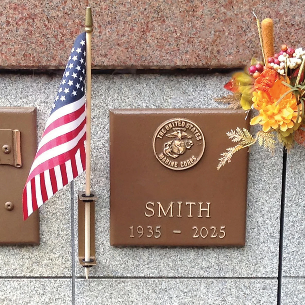 The Mausoleum Flag Holder is made from a solid aluminum 3″ base with a bronze finish. Easily mounted with a 3M Peel & Stick mounting tape and nylon grommets hold the flag firmly in place. Made in the USA.