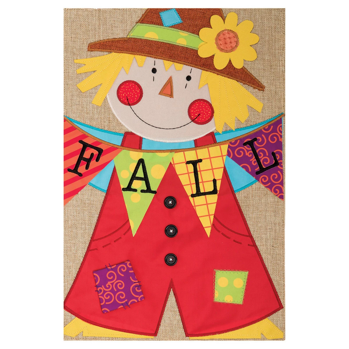This burlap garden flag features an appliqued scarecrow with embroidered accents. It is an applique flag that is readable from both sides and includes embroidered accents. This flag measures 12″ x 18″