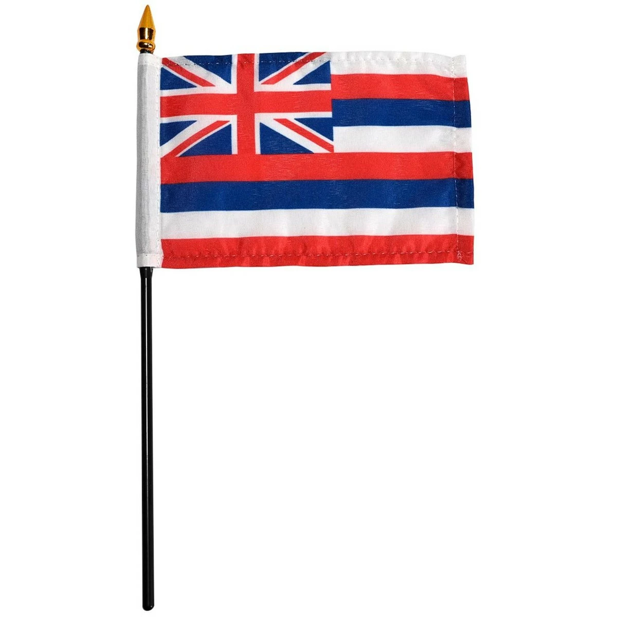 Hawaii state stick flag 4 inch x 6 inch, mounted on a 10 inch plastic stick. Flag is made from polyester and printed in bright colors to make an attractive flag. Each flag is individually sewn around the edges.
