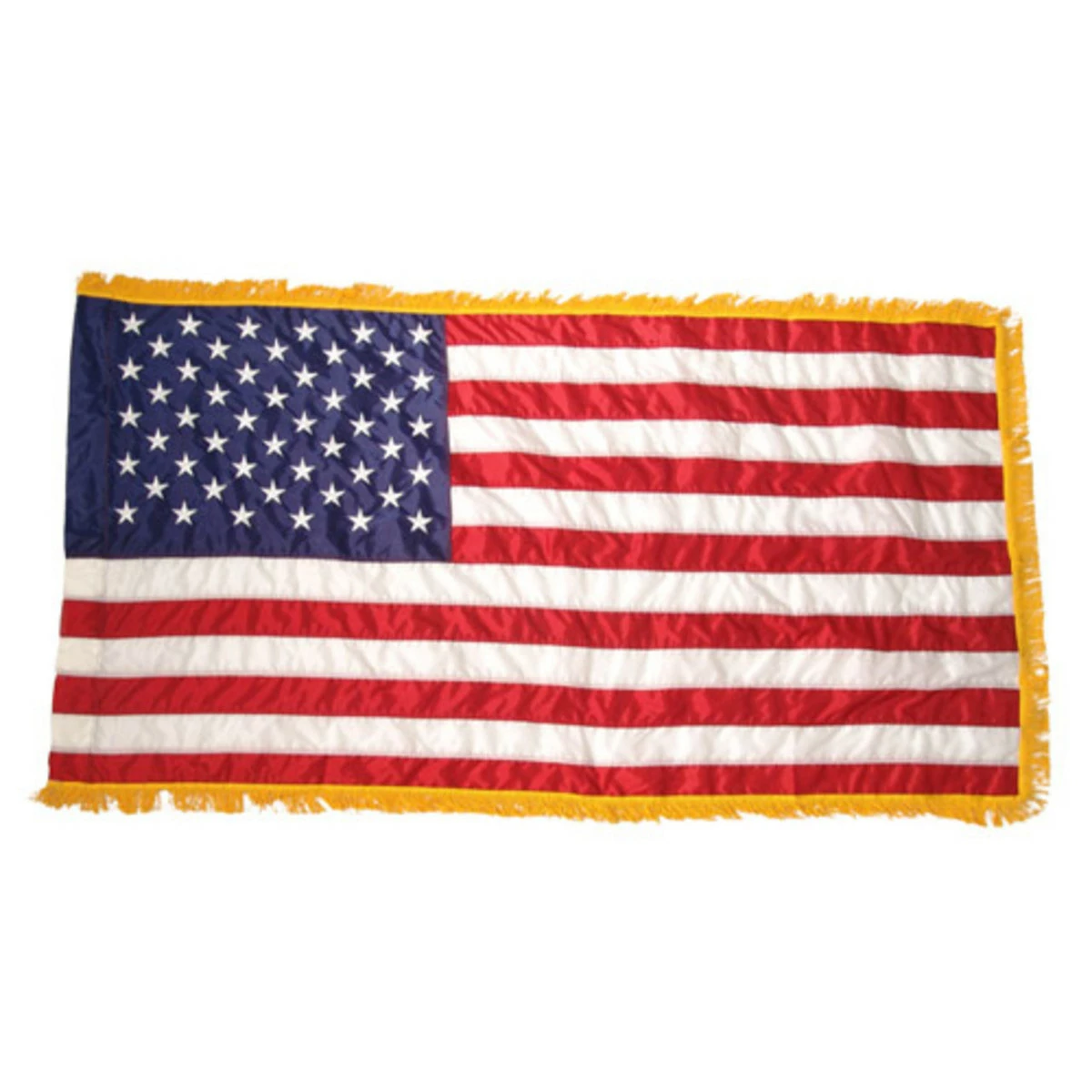 This American 3′ x 5′ Nylon flag comes with a pole hem and gold fringe and is made by a leading US Flag Company. This indoor flag is made with sewn stripes and embroidered stars.