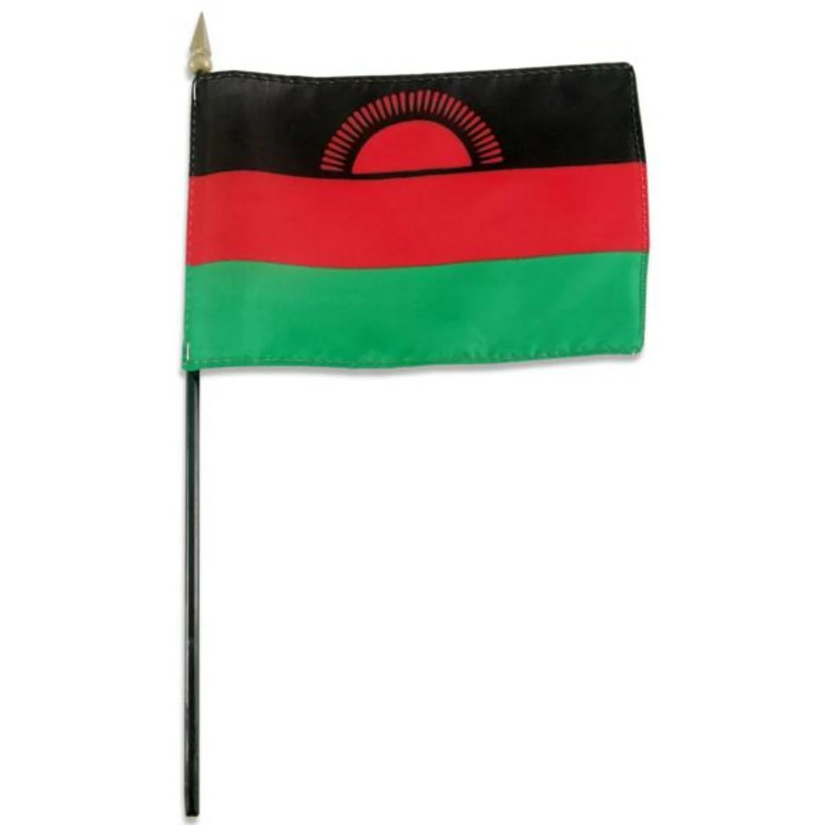 Malawi stick flag 4 inch x 6 inch, mounted on a 10 inch plastic stick. Flag is made from polyester and printed in bright colors to make an attractive flag. Each flag is individually sewn around the edges.
