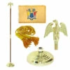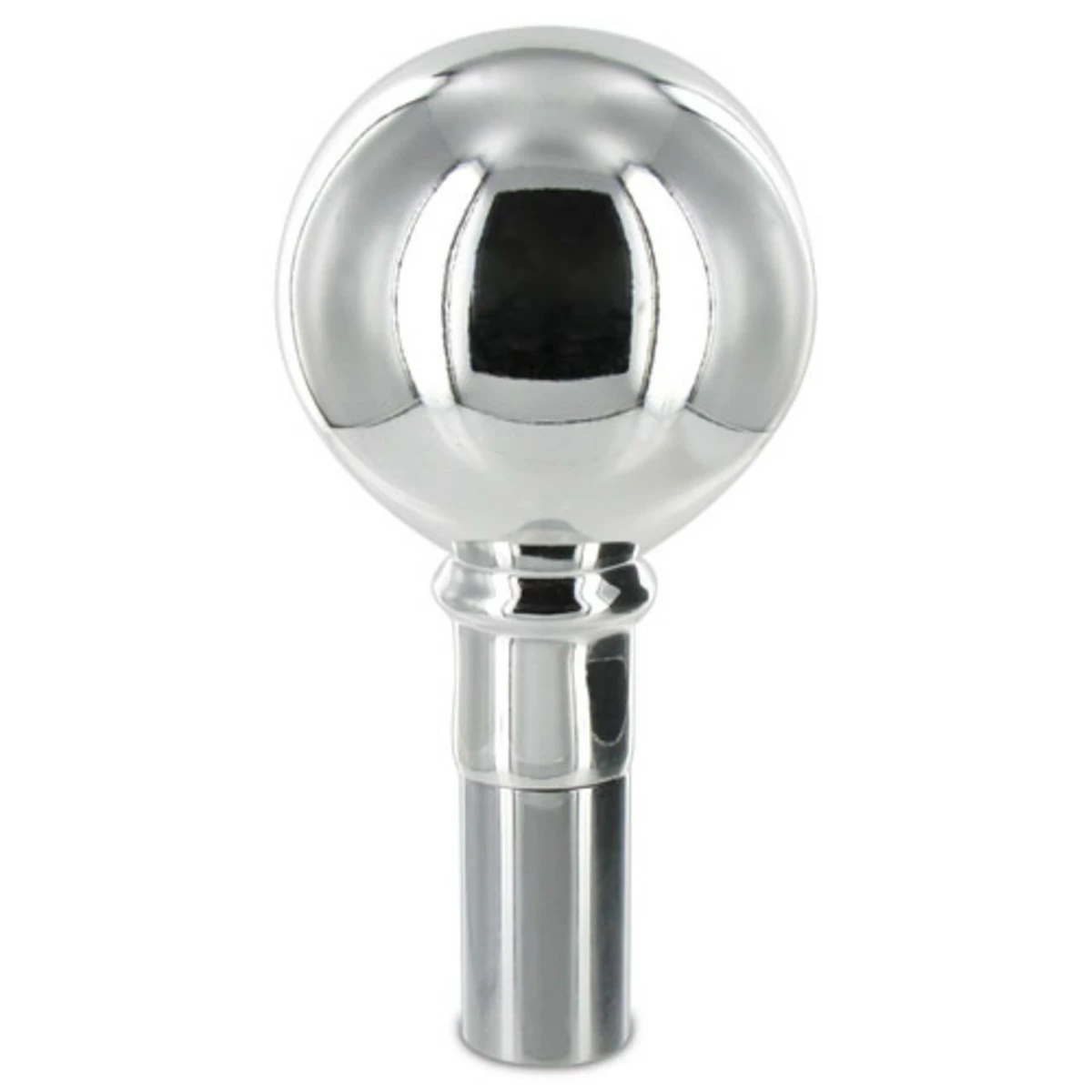 This parade ball is made of metal and measures 4.25 inches x 3 inches. It is coated in a shiny silver and comes with a ferrule. It is to be used with indoor wooden poles.