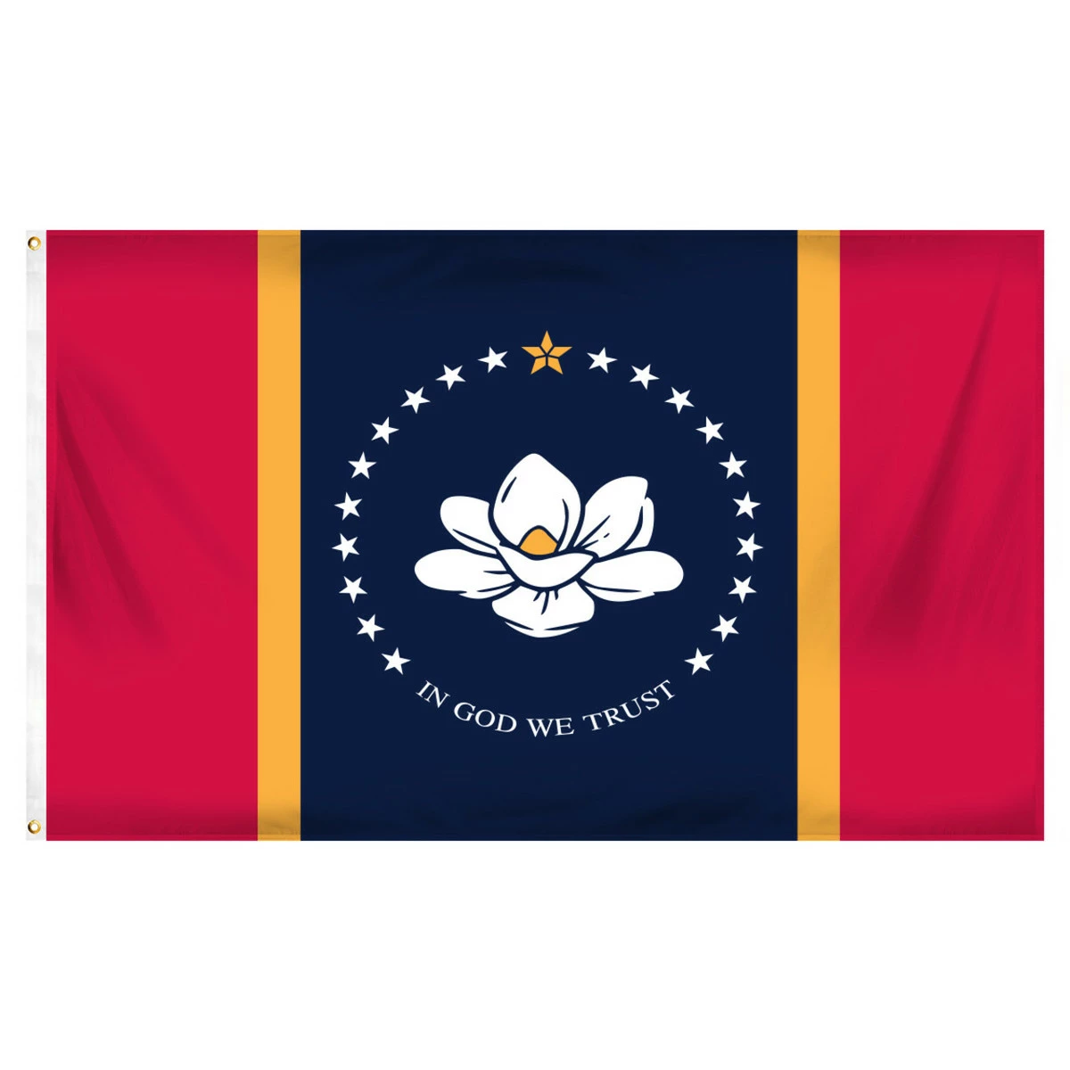 Our Super Knit Mississippi polyester flag is printed on silky-looking, knitted polyester fabric and finished with a sturdy nylon header with two brass grommets. This flag is suitable for outdoor use and is of much higher quality than a standard printed polyester flag. You will not find a better quality printed flag at a lower price!