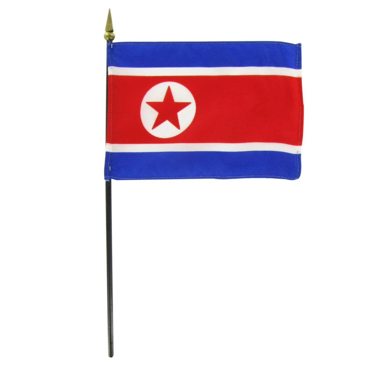 This beautifully printed 4″ x 6″ North Korea Stick Flag is made with a silk-like material and offers you the highest quality that you can find in a hand flag. They are carefully hem-stitched on all four sides for longer lasting durability and beauty.These flags come complete with a gold spear tip. Made in the U.S.A.