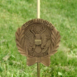 This Persian Gulf Grave Marker is made with solid bronze and has a gold color powder coat finish. The surface of the raised areas has been sanded to highlight the letters. This marker is made to hold a 3/8″ diameter flag and comes with an aluminum rod. Made in the USA