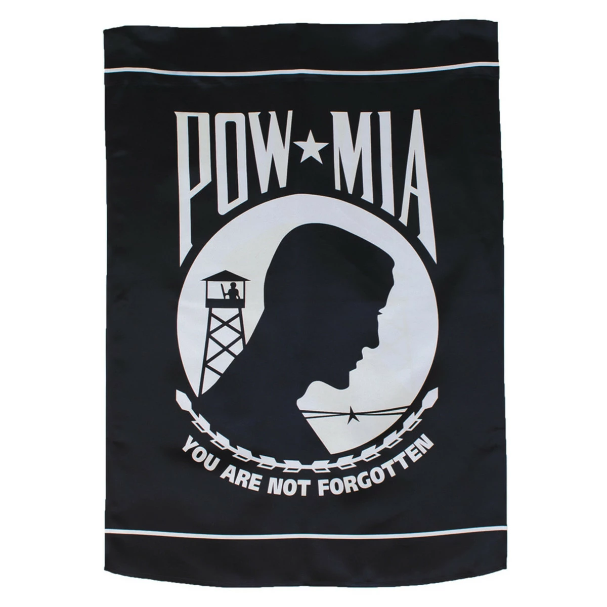 Fly the POW MIA Banner Flag in your yard or deck to honor the American Prisoners of War and those Missing in Action. This banner features stark black and white graphics on durable polyester fabric.
