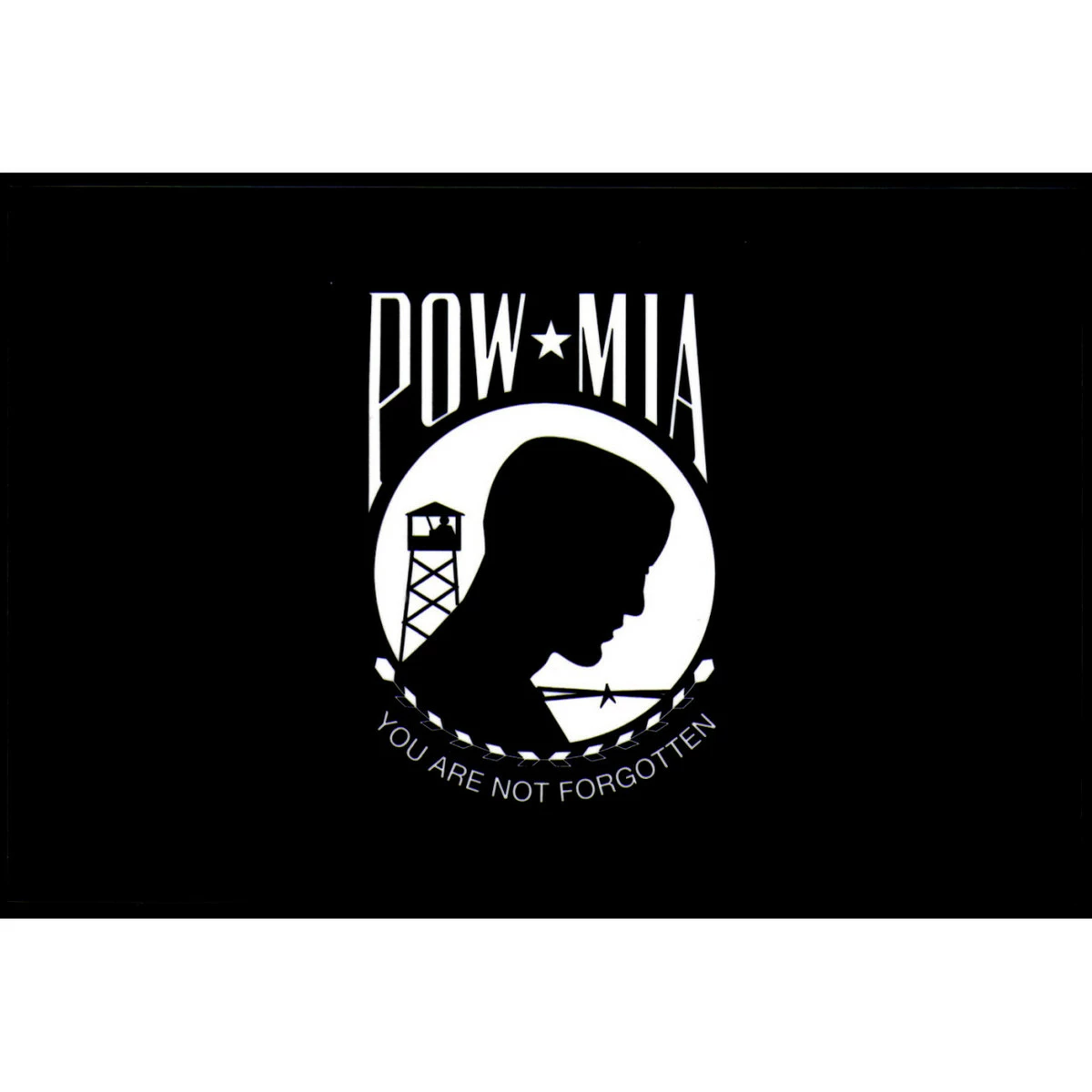 This POW/MIA Decal depicts the same image as the POW/MIA flag, a silhouette of a man’s head with a barbed wire fence and a watchtower in the background. Above the design is the title “POW/MIA,” and below the design the banner bears the motto “You Are Not Forgotten.” History of the POW/MIA flag Decal is made of vinyl.