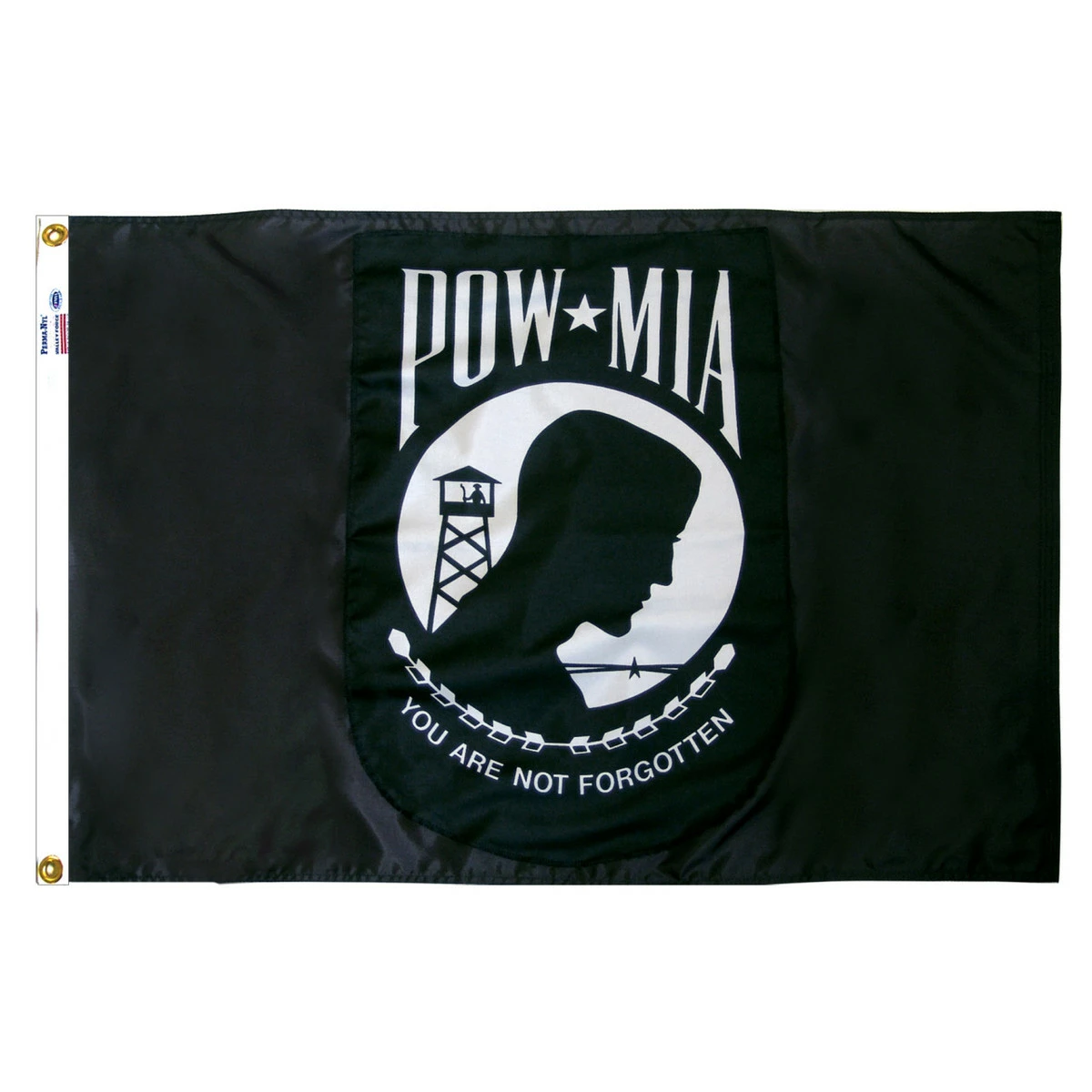 The POW/MIA flag depicts a silhouette of a man’s head with a barbed wire fence and a watchtower in the background. Above the design is the title “POW/MIA,” and below the design the flag bears the motto “You Are Not Forgotten.”