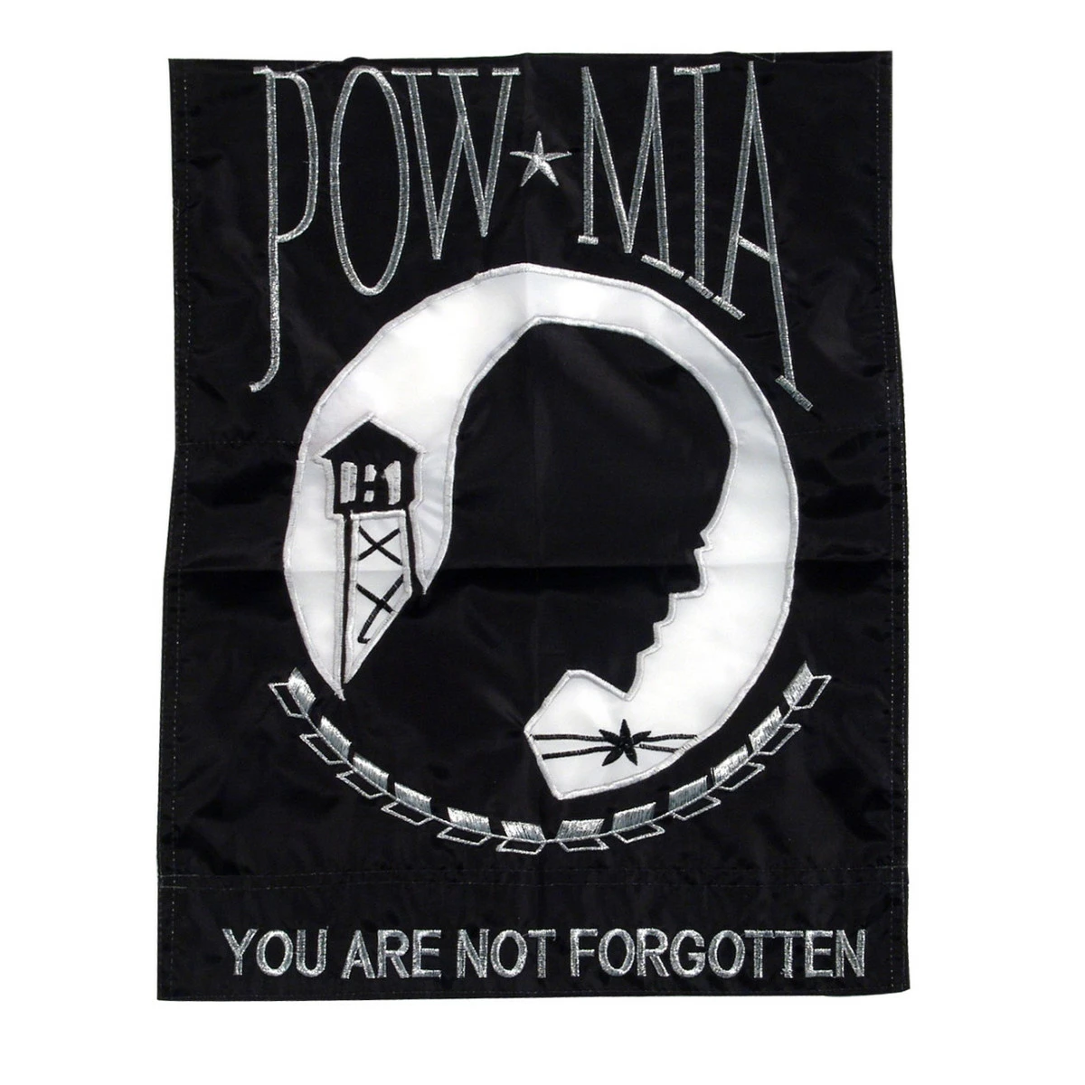 This POW/MIA Garden Flag depicts the same image as the POW/MIA flag, a silhouette of a man’s head with a barbed wire fence and a watchtower in the background. Above the design is the title “POW/MIA,” and below the design the flag bears the motto “You Are Not Forgotten.”