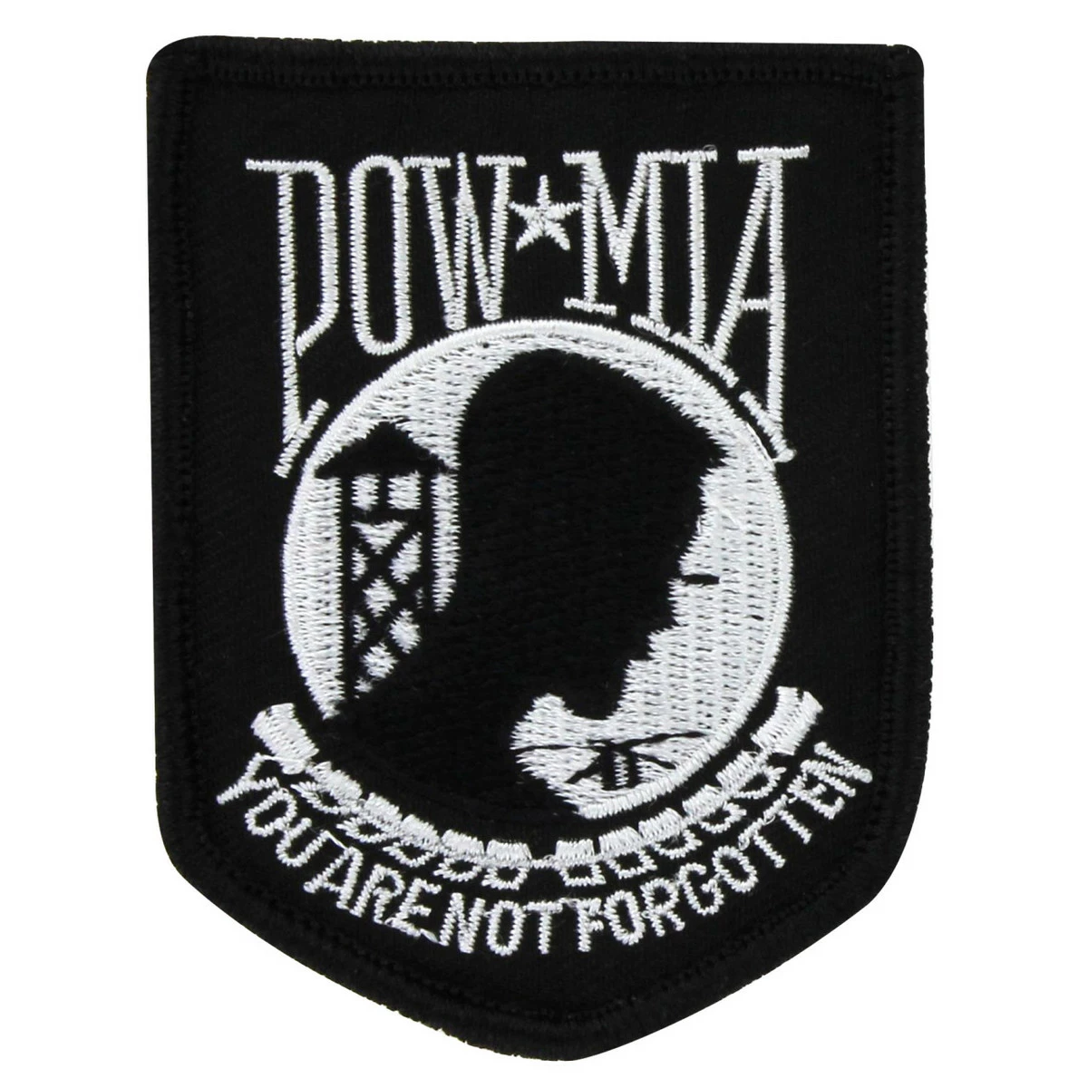 This POW/MIA Patch depicts the same image as the POW/MIA flag, a silhouette of a man’s head with a barbed wire fence and a watchtower in the background. Above the design is the title “POW/MIA,” and below the design the patch bears the motto “You Are Not Forgotten. Dimensions: 2.25″ x 3”
