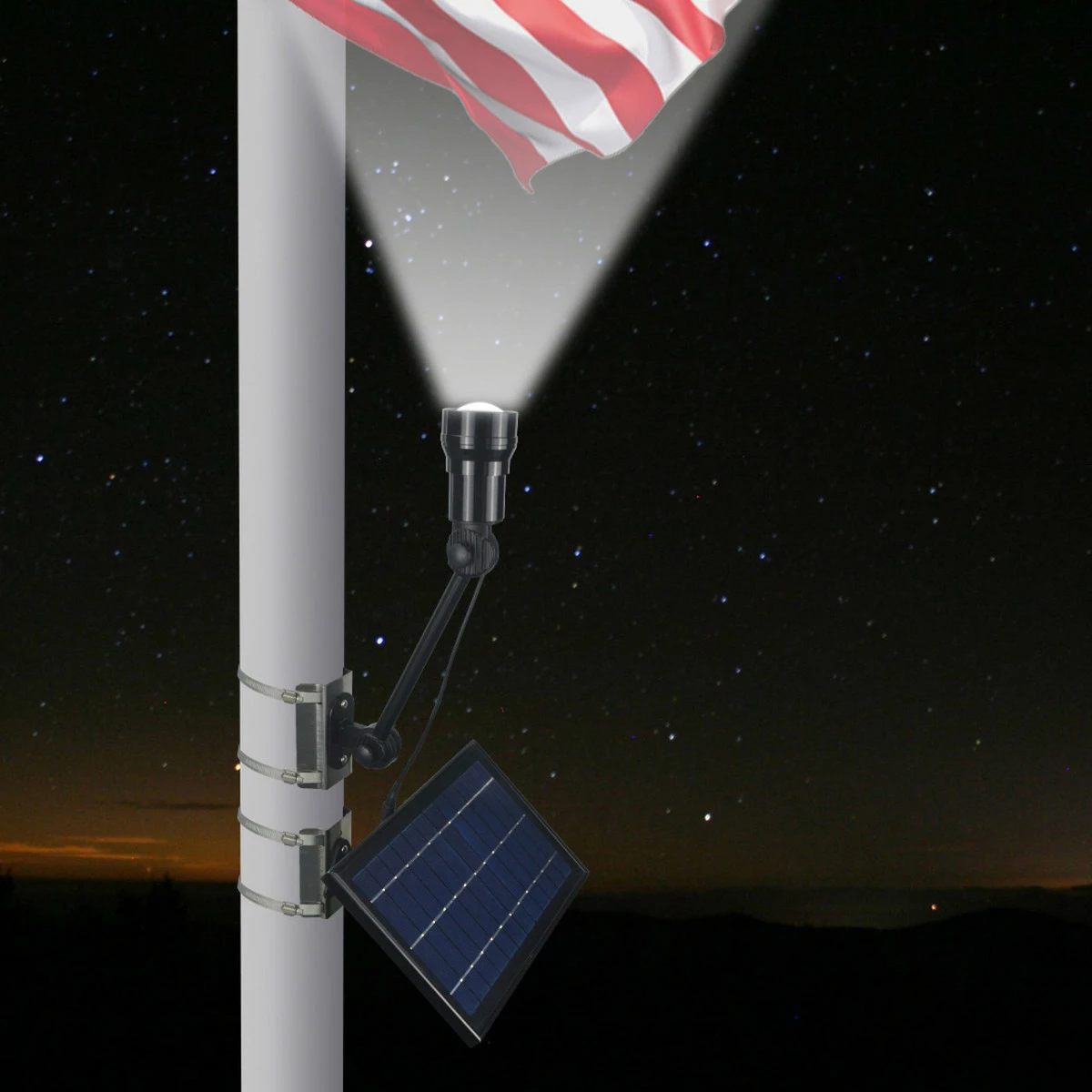 The Solar Adjustable Flagpole Spot Light converts sunlight into energy to power this light at night without the need for electrical wiring! This LED light charges during the day allowing the light up to 12 hours of runtime at night with a max output of 450 lumens. Installation is a breeze and can be installed anywhere along a flagpole. The light and solar panel are both independently adjustable to adjust up to 180-degrees for optimal illumination for the light and sun light absorption for the solar panel. The beam angle of the light is also adjustable so you can make the light spread a wider “flood” or have it more of a narrow “spot” light.