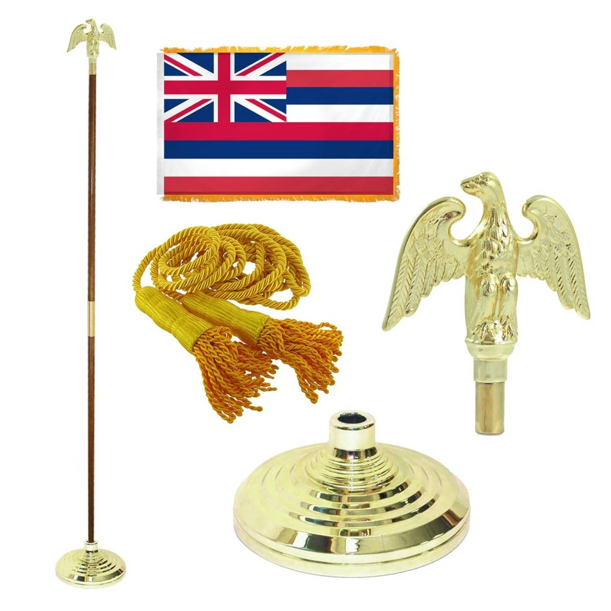 What is the specialty of a Hawaiian flag? It is the only U.S. state flag to have the Union flag of the United Kingdom which shows the historical influence of Britain. Along with this nylon 3 ft x 5 ft flag you can buy a flag base, and optional cord & tassel. You can also choose from a variety of pole toppers like 7-inch metal gold eagle, gold spear (plastic), gold metal spear, Army metal spear, gold metal parade ball, or Texas Star Metal.