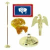 What does the year 1868 on the Illinois flag signify? It is the year in which the Great seal of Illinois State was redesigned. The state flag with golden fringe is made of nylon and measures 4 ft x 6 ft. It is accompanied by a flag base, and optional cord & tassel. You can also choose from a variety of pole toppers like 7-inch metal gold eagle, gold spear (plastic), gold metal spear, Army metal spear, gold metal parade ball, or Texas Star Metal. You can select an oak or a telescoping flag pole.