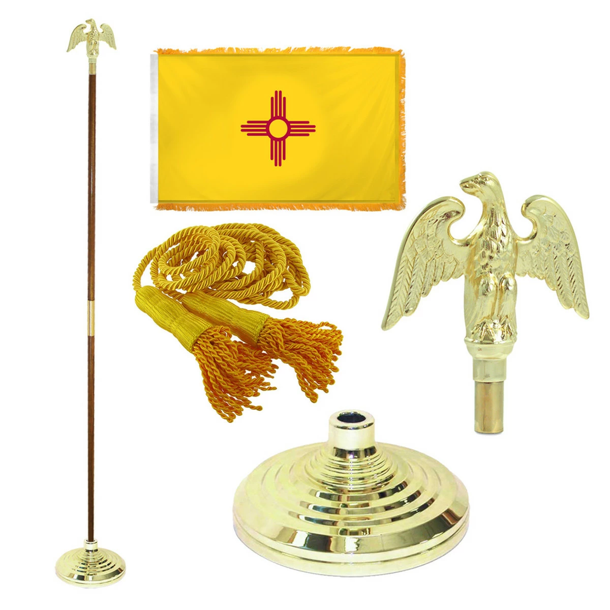 What is the red colored symbol found on the New Mexico state flag? It is the sun symbol of Zia, an indigenous tribe in New Mexico. Buy a 3 ft x 5 ft New Mexico state flag along with a flag base, an oak flag pole, and optional cord & tassel. You can also choose from a variety of pole toppers like 7-inch metal gold eagle, gold spear (plastic), gold metal spear, Army metal spear, gold metal parade ball, or Texas Star Metal.