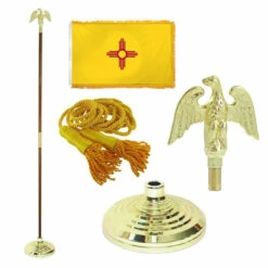 Do you know that the New Mexico state flag has the sun symbol of Zia on it? It shows the Spanish roots of New Mexico. Get a 4 ft x 6 ft New Mexico state flag along with a flag base, and optional cord & tassel. You can also choose from a variety of pole toppers like 7-inch metal gold eagle, gold spear (plastic), gold metal spear, Army metal spear, gold metal parade ball, or Texas Star Metal. You can opt between an oak and a telescoping flag pole.
