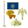 Why is Lady Justice blind-folded in the seal of New York State? She carries the scales of justice blind folded to show that every citizen has to be treated fair and just by the law. Now own a 4 ft x 6 ft New York state flag which is accompanied by a flag base, and optional cord & tassel. You can also choose from a variety of pole toppers like 7-inch metal gold eagle, gold spear (plastic), gold metal spear, Army metal spear, gold metal parade ball, or Texas Star Metal. You can opt between an oak and a telescoping flag pole.