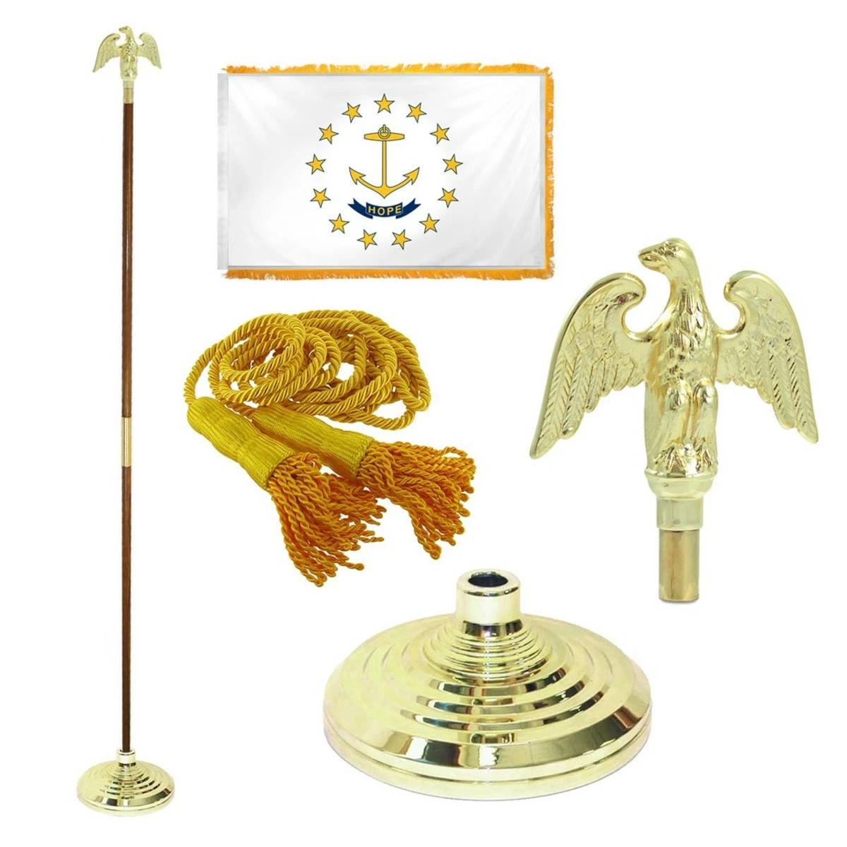 What does the anchor on the Rhode Island flag symbolize? It symbolizes Hope. Get a 4 ft x 6 ft flag with golden fringe. It has a silky finish. Enjoy it indoors along with a flag base, and optional cord & tassel. You can also choose from a variety of pole toppers like 7-inch metal gold eagle, gold spear (plastic), gold metal spear, Army metal spear, gold metal parade ball, or Texas Star Metal. You can opt between a 9 ft oak pole and a 9 ft telescoping flag pole.