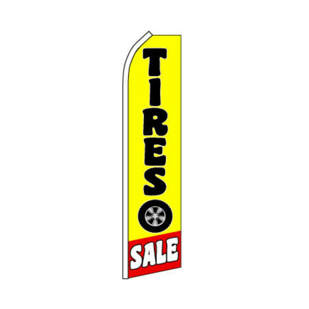 Announce your sale with this swooper flag that comes in a size of 11.5 x 2.5 feet. It can be hung outside or above your store and it has a reinforced pole sleeve in case you wish to add a pole for extra height. This Tires Sale Flag is made from knitted polyester and flutters in the wind – a bright yellow flag with a tire icon printed on it. Watch your business grow with our range of advertising flags and poles.