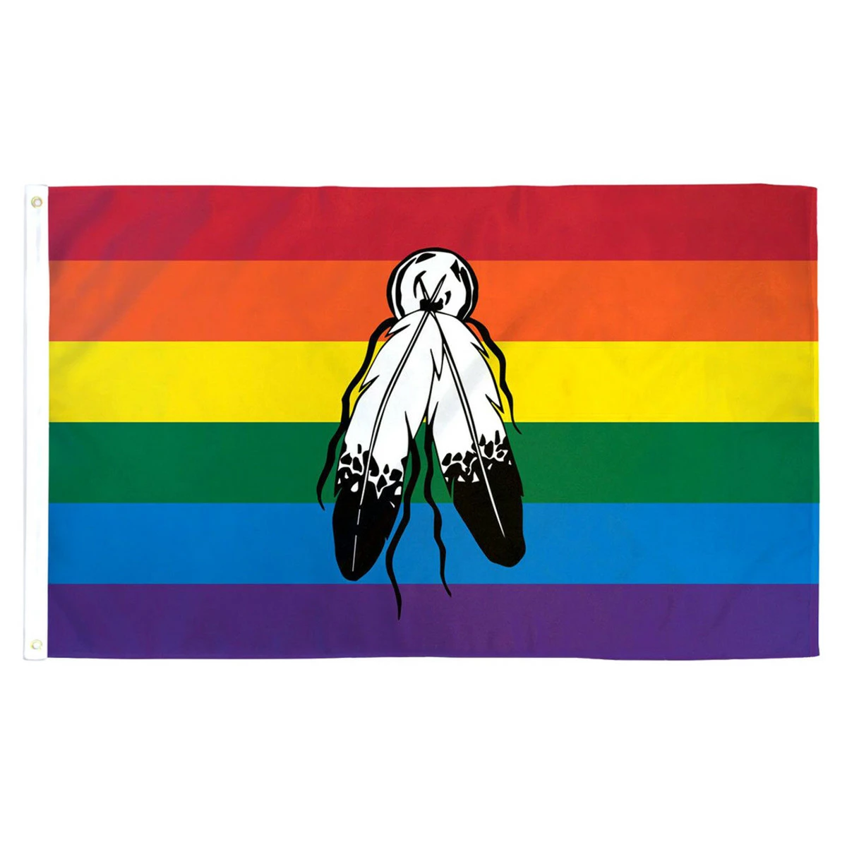 Top quality Two Spirit Rainbow Flag, made from a durable printed polyester. This flag is dye sublimated with beautiful bright colors and they are finished with header tape and grommets. It has double row stitching on all edges and 4 rows of stitching on the flyend.