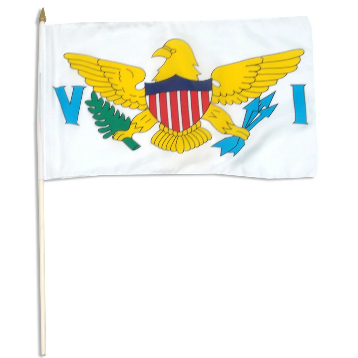 Virgin Islands state stick flag 12 x 18 inch, mounted on a 24 inch wooden stick. Flag is made from polyester and printed in bright colors to make an attractive flag. Each flag is individually sewn around the edges.
