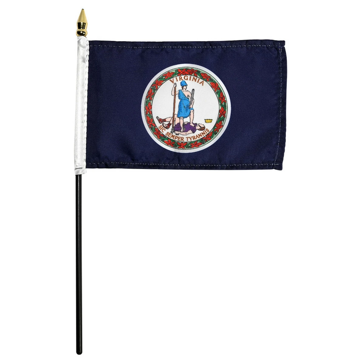 Virginia state stick flag 4 inch x 6 inch, mounted on a 10 inch plastic stick. Flag is made from polyester and printed in bright colors to make an attractive flag. Each flag is individually sewn around the edges.